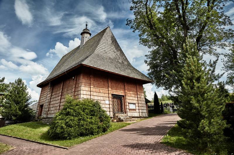 Kościół zbudowany został z drewna modrzewiowego w roku 1567. Jego największą atrakcją jest temperowa polichromia z roku 1647, przedstawiająca „biblię ubogich”. To pozostałość po kontrreformacji, której celem było uświadomienie przechodzącym z protestantyzmu na katolicyzm mieszkańcom, podstawowych prawd z historii zbawienia, w przystępnej, obrazkowej formie. Obok biblijnych scen figuralnych, znajdujemy na stropie przedstawienie Sądu Ostatecznego, dla którego tłem jest najstarsza znana panorama Tatr. Łatwo rozpoznać można charakterystyczne sylwetki Hawrania, Płaczliwej Skały i Lodowego. Z kolei akt Wniebowzięcia i Koronacji NMP umiejscowiony został w czorsztyńskim przełomie Dunajca, pomiędzy zamkami niedzickim i czorsztyńskim.