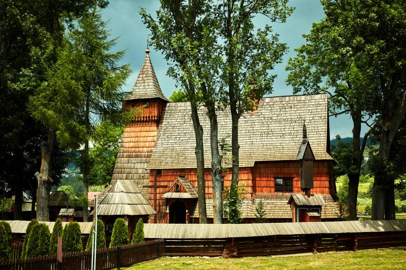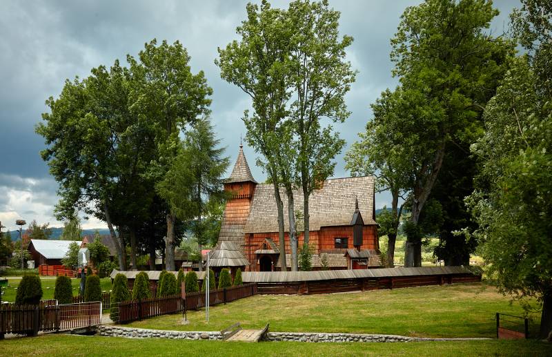 Kościół ten to najcenniejszy z zabytków Podhala. Zbudowany ok. 1480, posiada najstarszą na świecie polichromię, pokrywającą całe wnętrze drewnianej konstrukcji świątyni. Polichromia, licząca, tak jak i kościół niemal 540 lat, wykonana jest w 33 kolorach i zawiera 77 powtarzalnych motywów. Bardzo cenny jest obraz w ołtarzu głównym. Przedstawia on „świętą rozmowę” św. Katarzyny i św. Michała Archanioła z Matką Boską (ok. 1500). Obraz ten stanowi przykład przejścia ze średniowiecza do renesansu w malarstwie sakralnym – choć postacie są jeszcze monumentalne (średniowiecze), w tle pojawia się już krajobraz (renesans). Najstarszym obiektem jednak jest krucyfiks w tęczy (XIV w.), zwany „drzewem życia”, gdzie pionowa belkę stanowi pień drzewa, a ramiona – wyrastające gałęzie. Krzyż ten – to pozostałość wcześniej istniejącego tu kościoła. Niżej, na ścianie – kopia najstarszego polskiego obrazu sztalugowego (XIII w.), przedstawiającego święte Katarzynę i Agnieszkę, który znaleziono tu podczas jednego z remontów. Obok – proporzec husarski wojsk Jana III Sobieskiego, które przez Dębno wracały do kraju po wiktorii wiedeńskiej. Wbrew prawom fizyki działają tajemnicze cymbały, służące jako gong mszalny. Cienka sztabka wydaje dźwięki niskie, gruba zaś – wysokie.